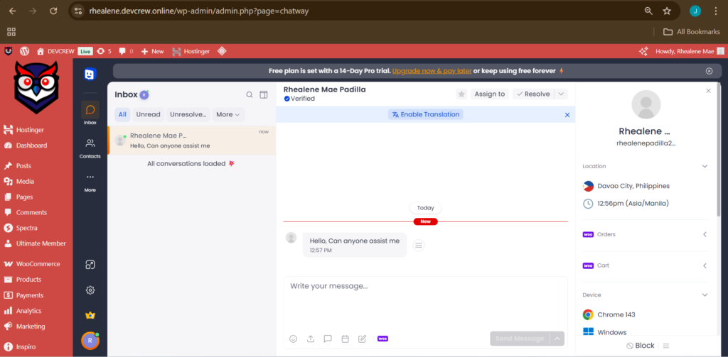 The image displays the Chatway plugin interface within the WordPress dashboard, focusing on the Inbox section. This area shows real-time chat conversations between website visitors and the site administrator.
