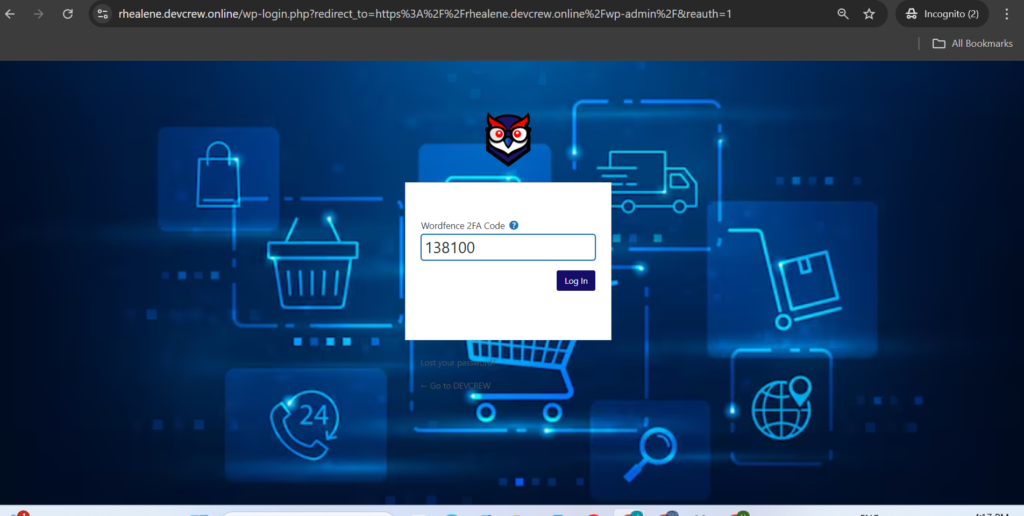 Upon successful entry of credentials, the user is prompted by Wordfence for a 6-digit two-factor authentication (2FA) code (shown as 138100). This additional security layer ensures that even if login details are compromised, unauthorized access is prevented without the unique, time-sensitive code, typically generated by an authenticator app such as Google Authenticator or Authy.