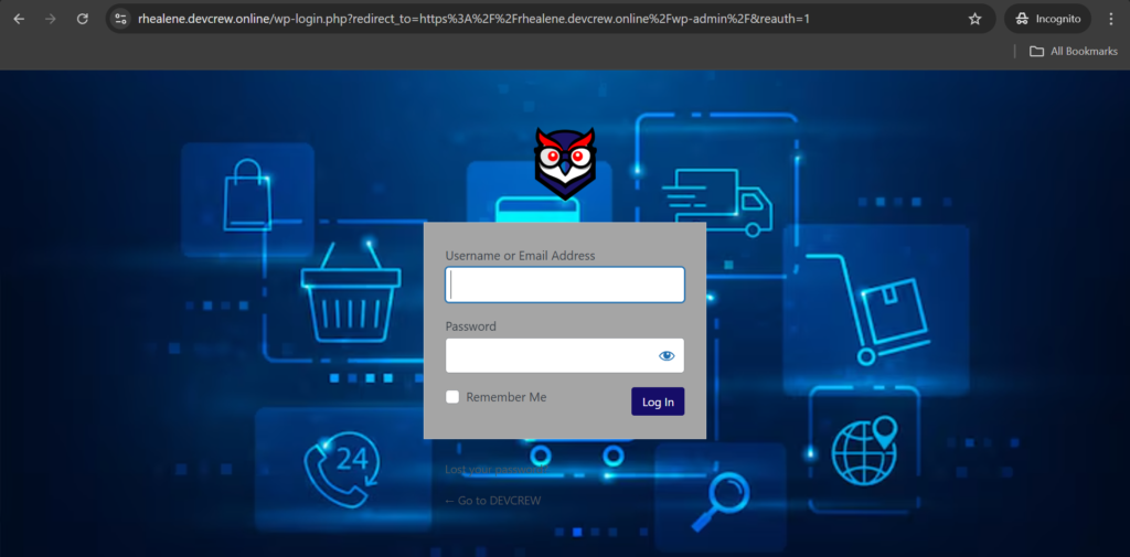 The first image displays the WordPress login screen, where the user enters their username (Rhealenepadilla28@gmail.com) and password, with the “Remember Me” option available and the “Log In” button ready for submission.