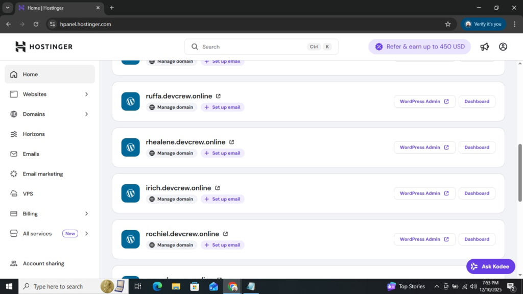 Hostinger is used to manage multiple WordPress-based project websites. Each listed domain includes options to open the WordPress Admin dashboard, configure the domain, and set up email accounts. This setup allows developers or students to deploy their web projects, manage content, and maintain multiple sites efficiently within a single hosting environment.